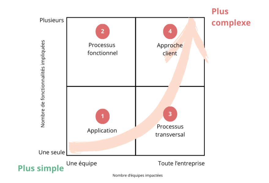 Cadran 4 : Projet de haute complexité, impliquant plusieurs fonctions et équipes devant collaborer et une dimension plus stratégique et culturelle.